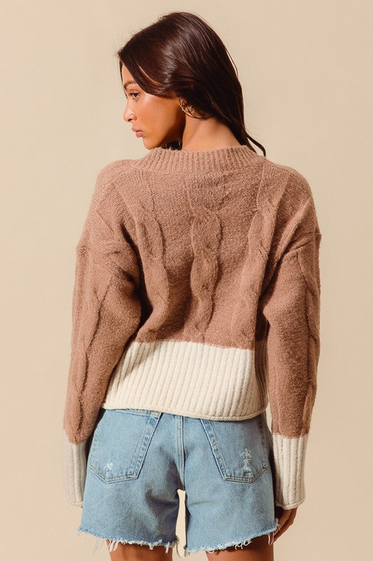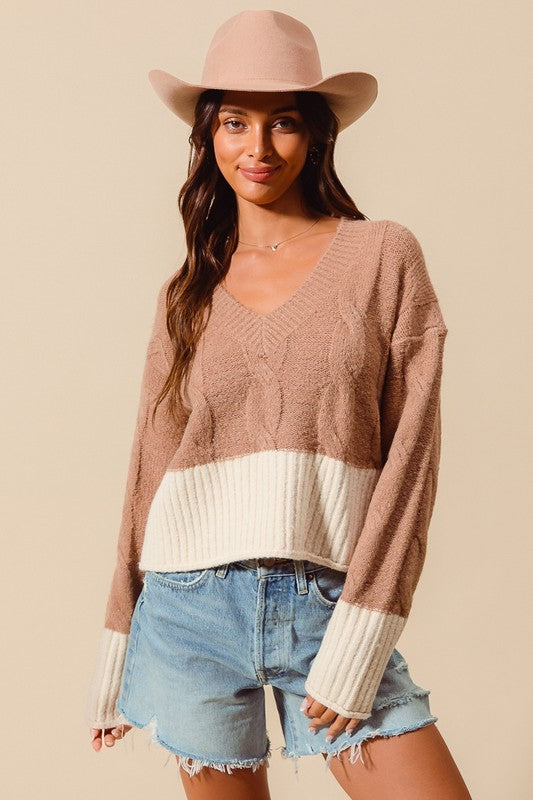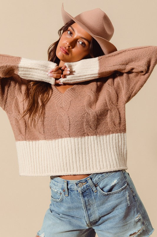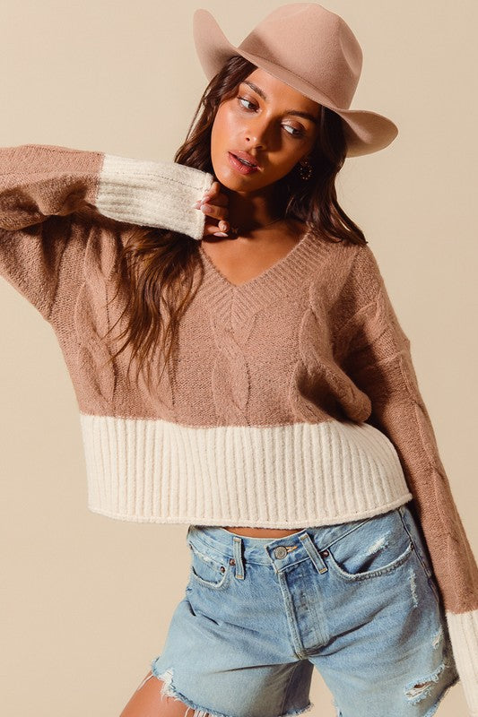 CABLE KNIT V NECK CROP SWEATER TOP WITH CONTRAST RIBBED HEM